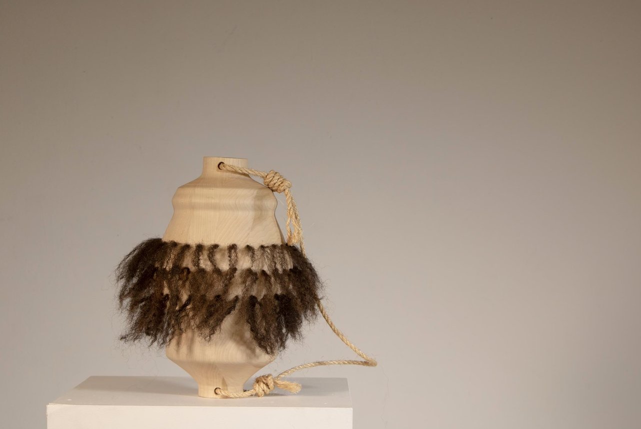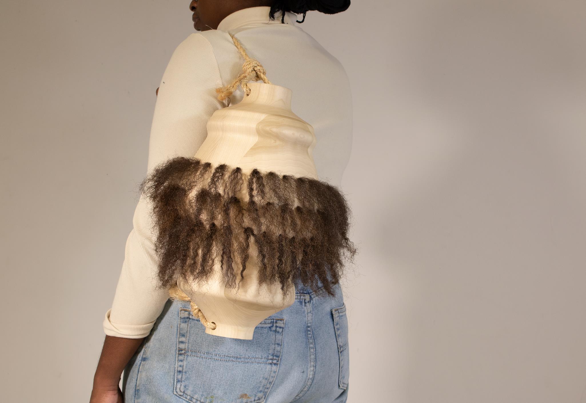 Strange Fruit (1937) d’Abel Meeropol est un poème glauque, sinistre et mélancolique, qui témoigne de l’absurdité des pratiques de lynchage de personnes racisées dans l’Amérique postcoloniale; il est chanté ici par Billie Holiday. Comme l’évoque le poème, pour les détruire, les victimes de lynchage devaient être réduites à un statut d’objet. Ma réflexion sur les enjeux liés au racisme systémique et aux relations de pouvoir entre ethnies m’a menée à produire un objet de commémoration de ces victimes, sous forme d’urne-tête pouvant à la fois s’accrocher à une branche d’arbre, s’en décrocher ou se porter au corps. La corde destinée à servir d’abord d’outil de pendaison se transforme par la suite en ganse de bandoulière. Je vois dans cette transformation un geste de guérison symbolique par lequel je me charge de porter le poids d’une souffrance transgénérationnelle.