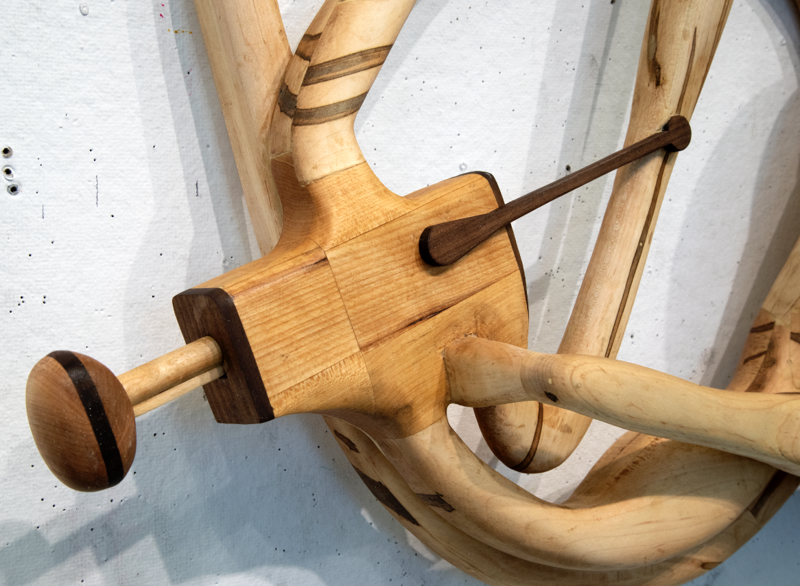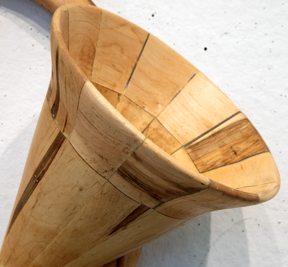 Cor québécois est un instrument fonctionnel inspiré des cuivres traditionnels, réalisé en érable et intégrant des appeaux de chasse dans sa structure interne. Une valve permet de diriger le souffle de l’interprète afin de simuler le cri du chevreuil, de la bernache ou du lapin en détresse. Cet instrument-sculpture est issu d’une recherche plus large sur la tension entre les fonctions utilitaires et symboliques des objets, produite grâce à des formes inusuelles. Il est le résultat d’une rencontre entre diverses matérialités – les tonalités mimétiques des appeaux de chasses, le design fonctionnel des instruments chromatiques, l’esthétique artisanale –, qui produit une ambiguïté quant au contexte d’utilisation de l’objet et à sa fonction. L’objet relève aussi la notion de valeur et de prestige de l’instrument en cuivre, témoignant de son unicité et du labeur nécessaire à sa fabrication. J’explore ainsi les contradictions mais aussi les rapprochements entre deux univers hétérogènes, celui de la chasse et celui de la musique.