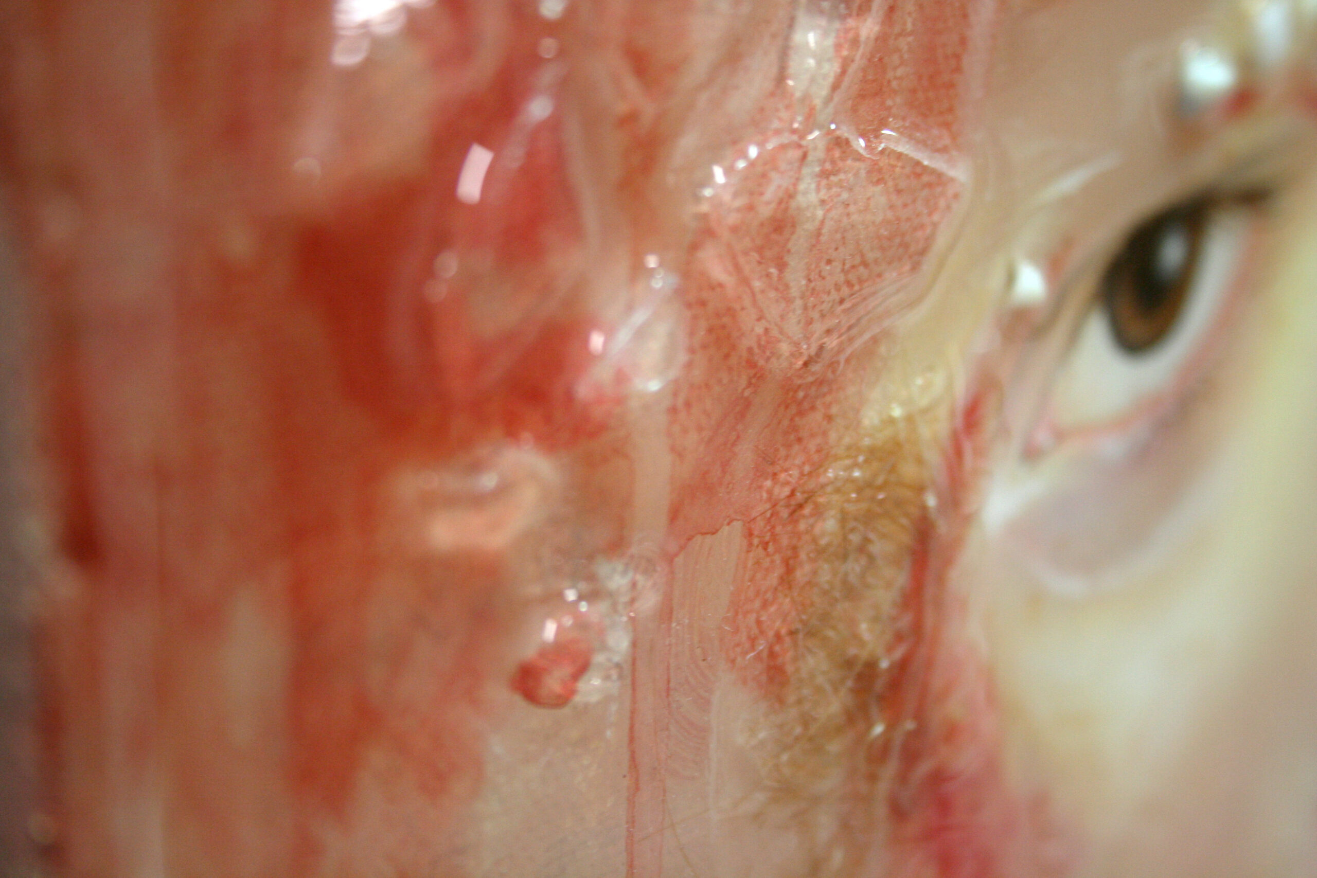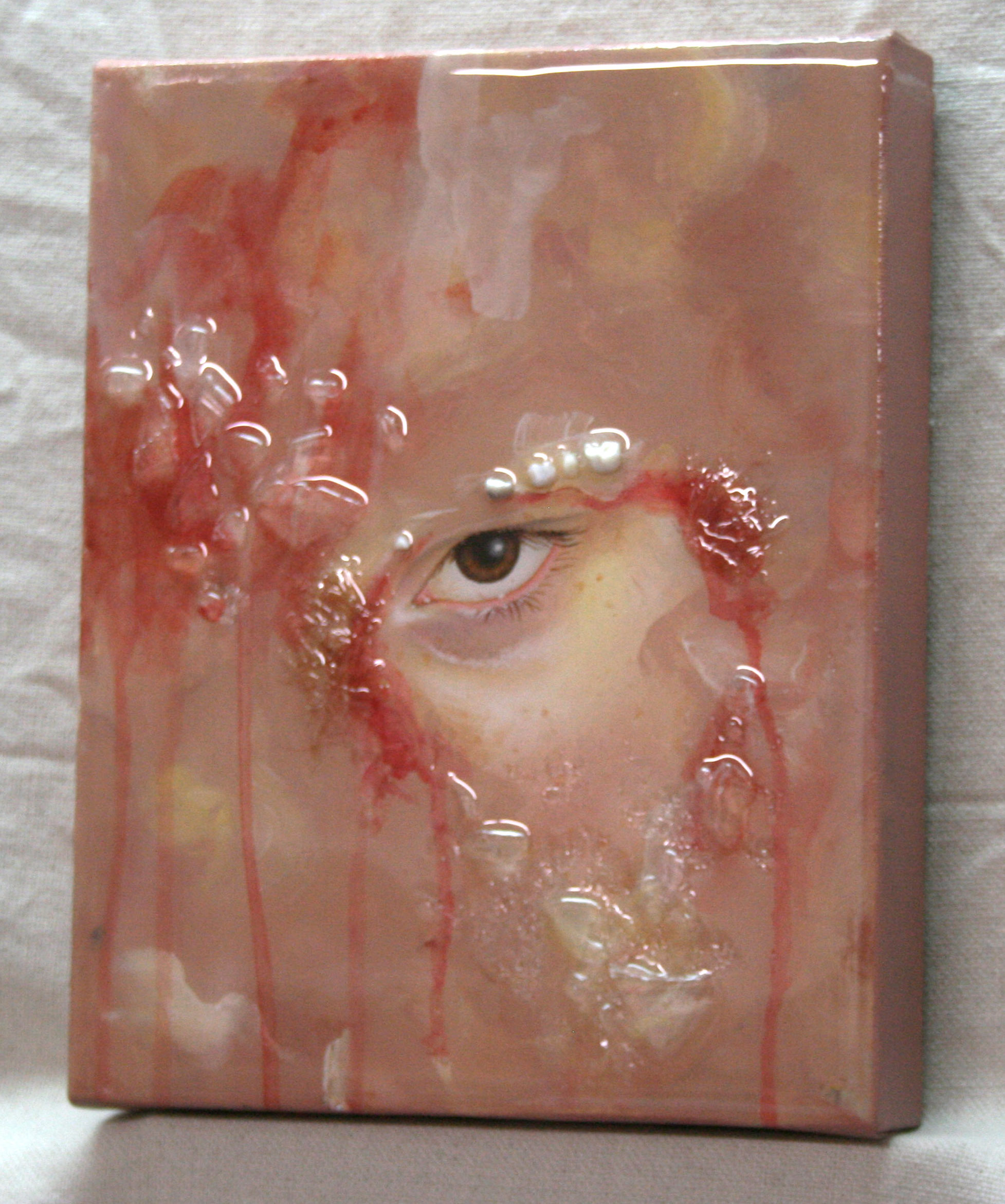 Mue représente un œil peint de manière photoréaliste, qui mute en une abstraction gorgée de corporéité et d’humeurs. C’est l’œil de l’artiste, qui émerge d’une abstraction picturale évoquant la chair. Trouvant réconfort dans la représentation et la figuration, que j’aborde selon une approche plus traditionnelle de la peinture, je porte intérêt tant à l’étude de la matière qu’au jeu de l’illusion. Ce tableau incorpore des matériaux tels que la résine, des dents ou des cheveux. Il témoigne ainsi de recherches sur la matérialité plastique et organique qui questionnent la surface bidimensionnelle du tableau et qui l’inscrivent dans une quête épicurienne de sensations. Proposant une expérience de la présence et de l’incarnat, Mue manifeste le caractère sensitif qui s’active dans l’expérience perceptive du spectateur comme au sein de mon processus de création.