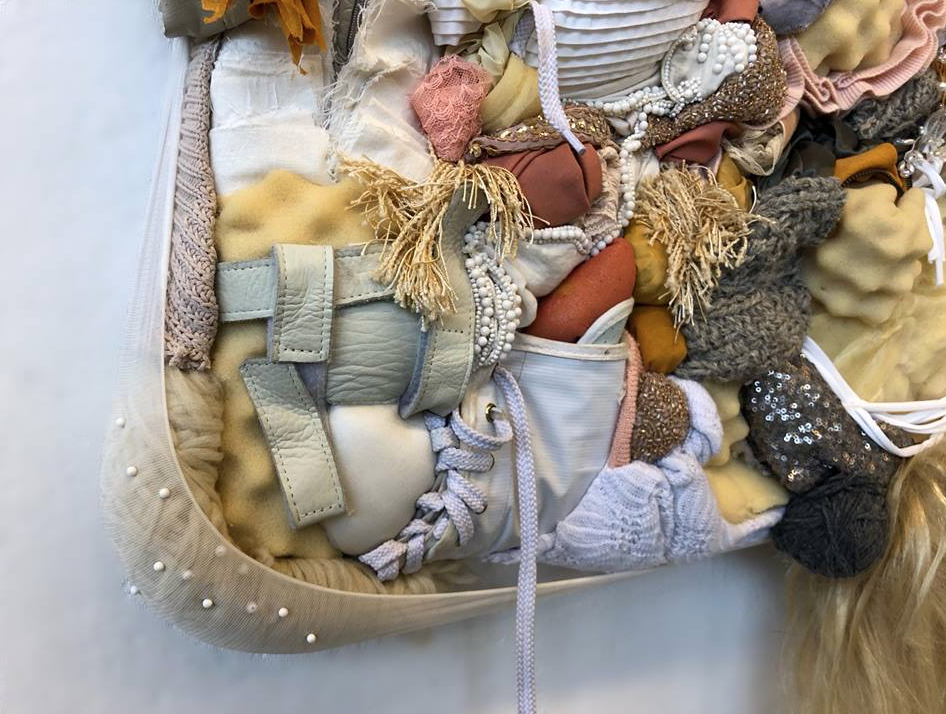 Ma démarche tourne autour de l’interrelation entre le corps et le vêtement. Je m’intéresse aux corrélations possibles entre les tissus anatomiques et les textiles vestimentaires. Fibre identitaire aborde la matérialité en empruntant aux codes de la peinture, mais son processus de création par assemblage, couture, broderie et teinture de tissus récupérés auprès d’ateliers de costumes et de designers locaux s’apparente plutôt au Sloppy Craft. Dans une optique d’invention de matières durables et respectueuses de l’environnement, mon action se précise aussi par la fabrication de biomatériaux que j’intègre à l’œuvre. J’aborde ainsi la surconsommation et la surproduction des matières (notamment textiles) en mettant en relation des matériaux synthétiques industriels avec des matières organiques que je crée à partir de produits naturels environnants. Ce tableau-objet est déterminant dans mon cheminement, car il manifeste une hybridité de disciplines, techniques et matériaux qui m’amène à approfondir la réflexion sur la réactualisation des savoirs.