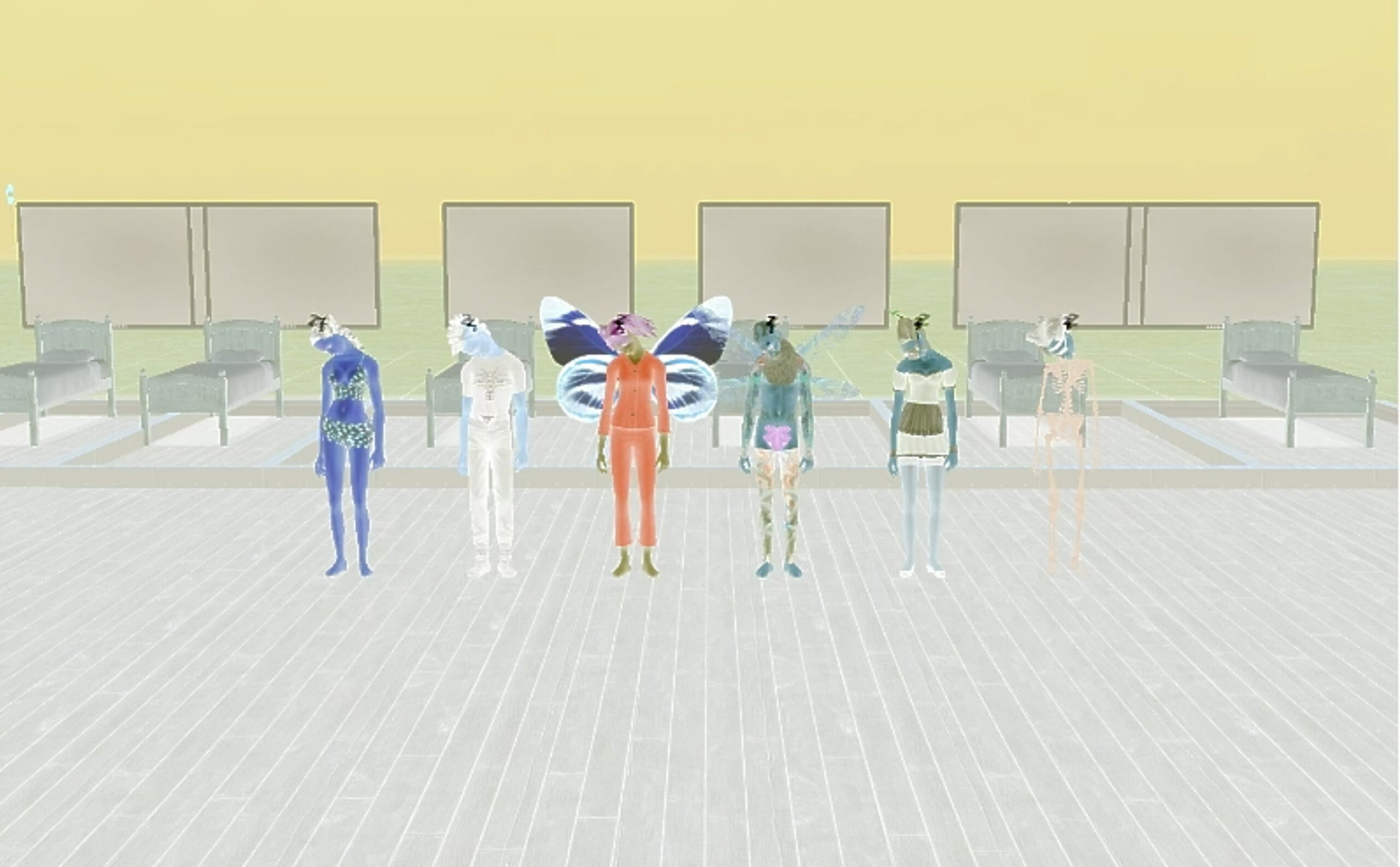 Je suis très préoccupée par les questions que soulèvent la surexposition aux écrans, l’immersion virtuelle et la surconsommation. Depuis l’hiver 2020 en particulier, beaucoup de travailleuses, d’étudiants et d’adolescentes doivent s’habituer à une routine de télétravail. Même lors d’une pandémie mondiale, il est attendu que les personnes performent autant qu’avant en se rendant disponibles pour leur employeur, en étudiant à distance ou en entretenant leurs relations sociales virtuellement. Créé à l’aide du jeu vidéo Les Sims 2, le machinima :)$): exprime la détresse des individus face à la difficulté de contrôler leur exposition excessive aux écrans et à l’impossibilité d’y échapper. Cette surexposition étant profitable aux géants du Web et aux entreprises, elle encourage un désir accru de consommation. L’œuvre présente, par conséquent, une critique du capitalisme sauvage, de la société de performance et de la dépendance technologique qui en découle. Elle souligne les côtés pervers de la culture d’entreprise et du rythme effréné de notre société.